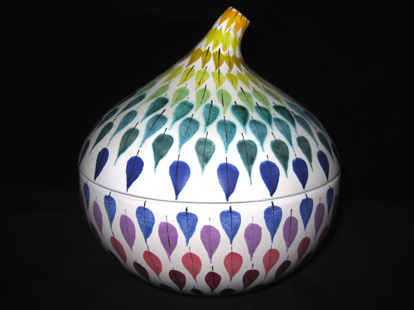 His leaf bowls are amazing, iconic. They are 3-d leaf shapes, painted with abstracted leaf patterns and the overall effect is a wowing simplicity. They don’t look like leaves but they evoke leaves – and are so tactile. This part of my collection is really very joyful and uplifting to look at and touch.