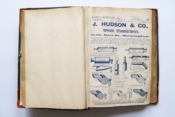 Many people collect whistles, but few have the breadth and range that Acme has in it’s own design archives. Luckily the Hudson family were meticulous archivists and as a result Acme still holds an enviable historical record of the design and development of the whistle industry; including early ledgers, patents, advertisements, prototypes, production pieces and not to forget the actual factory itself – a beautiful listed building situated in Birmingham’s Victorian Jewellery Quarter.