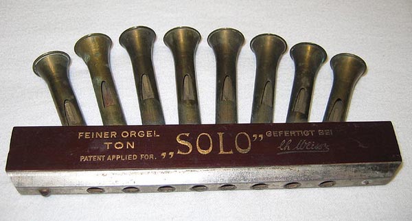 Anything with horns, bells, whistles or an unusual shape sure gets my attention. One of my favourite finds was one I was told didn't exist. It is called a "Solo" ans was made by the Christian Weiss harmonica company in Germany in 1904. There was a patent ink drawing of this harmonica on a website but the accompanying statement indicated that it was never produced. I discovered this harmonica on a Swedish website and managed to buy it. It is unique in that it has eight brass horns with the reed in the horn rather than in the body of the harmonica. Each horn has a numbered removable reed. It is the only complete one that I have ever seen.