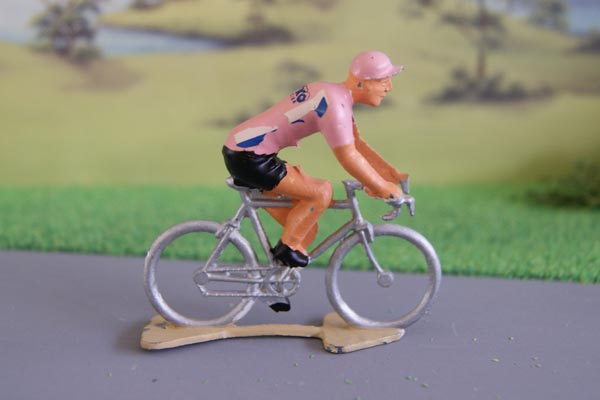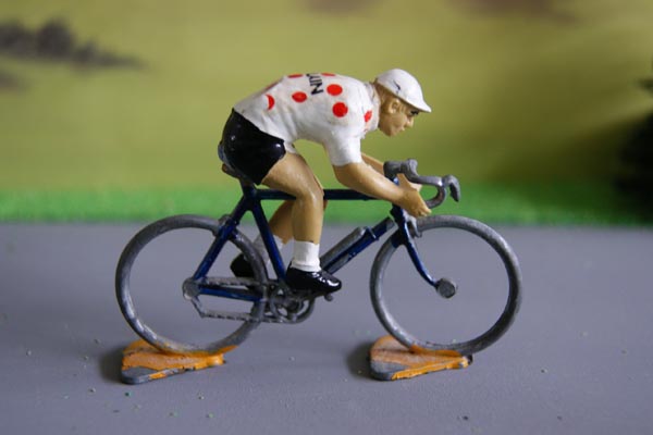 They seem like an unusual piece of cycling memorabilia. The first one I bought is the spotted jersey figure, or King of the Mountains. This is arguably the most romantic jersey, awarded to the rider who proves to be the best at climbing. Grand tours can be won and lost in the mountains, and the greats of the sport are typically those that have proved their worth in the big hills. Multi stage races are a mix of tactics, alliances, luck, stamina and mental strength. There are races within races; only a few riders are capable of winning the whole event (in the tour de France depicted as the wearer of the yellow jersey). To keep interest, sponsors introduced other jerseys, hence the spotted jersey for mountains and the green jersey for sprinters.