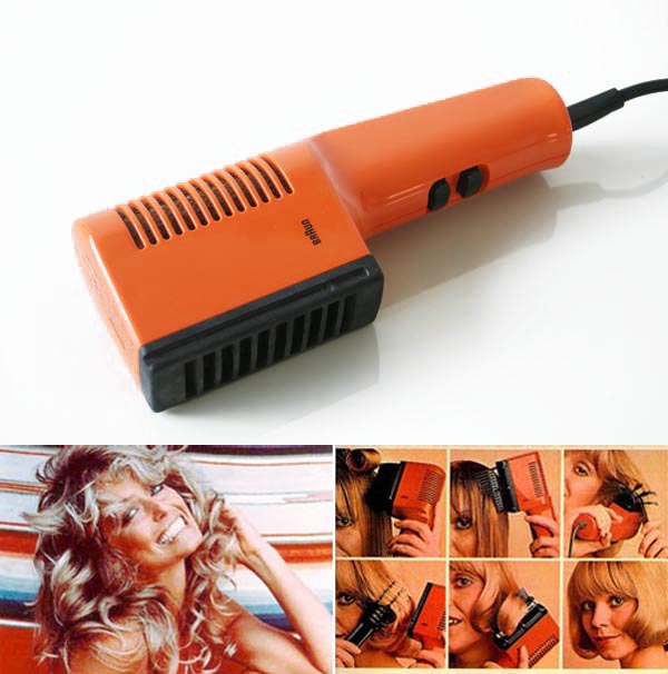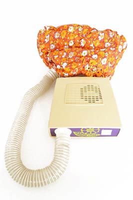 During the 60s and 70s portable vanity hood units were popular. These consisted of a PVC bonnet attached by a hose to a hairdrying unit that came complete with a strap that you could casually sling over your shoulder, leaving you free to wander around in your rollers drying your hair whilst doing the ironing or some other household chore! The pscyhedelic orange and purple model below was produced by Boots.
