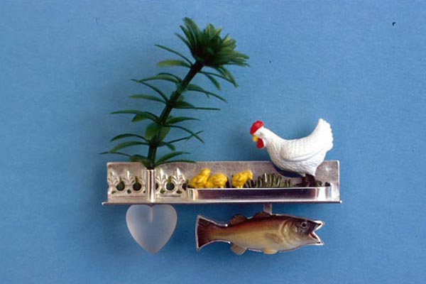 I have produced a small series of brooches called Dear Green Place, which is the Glaswegian term of endearment for that city, Glasgow. The City’s Coat of Arms depicts a bird, tree, bell and fish and a rhyme, attributed to the writer Daniel Defoe following a visit to the city in the early 18th century, reads;