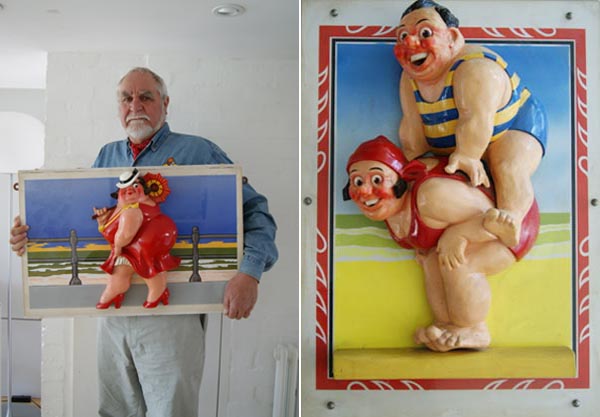 Having gone through art school when Pop Art as a movement was developing, I have always had a strong interest in brash, highly coloured commercial and popular imagery, seaside postcards being a striking example. As most of my models tend to have a comic element, fat ladies in period bathing costume seemed an irresistible direction to go in and Tempest's drawings became a major inspiration. The models featured are made from clay, biscuit fired and painted in enamel.
