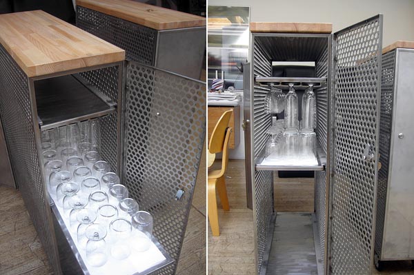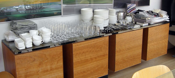 Most of it lives in two custom-built rolling files that resemble post-modern airline aisle serving carts. This is so that I can use them easily whenever I want to through a special dinner party. Almost all of the service ware is efficiently packed into these, which can be wheeled around my house, if necessary, and can serve as service bars. They're a bit extravagant but they do the collection justice. I'm embarrassed to say that almost all of the gift items and non-service memorabilia live in boxes, packed away in a closet. I don't have any display cases for them and probably wouldn't put them out for display if I had the room over, say, other art in my home. Of course, they're most accessible online at my website.
