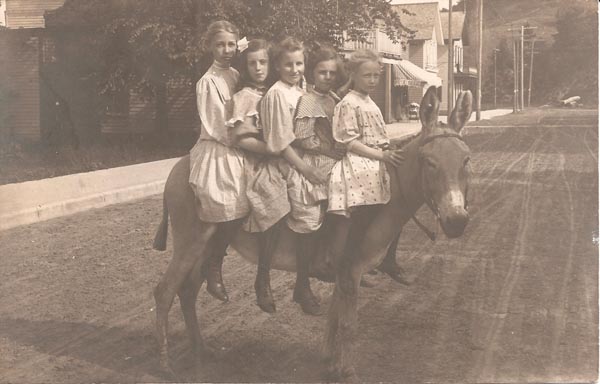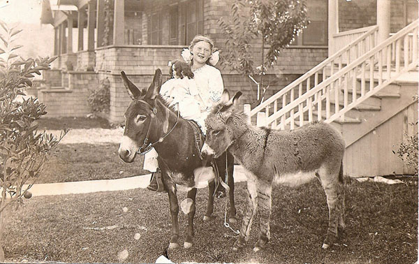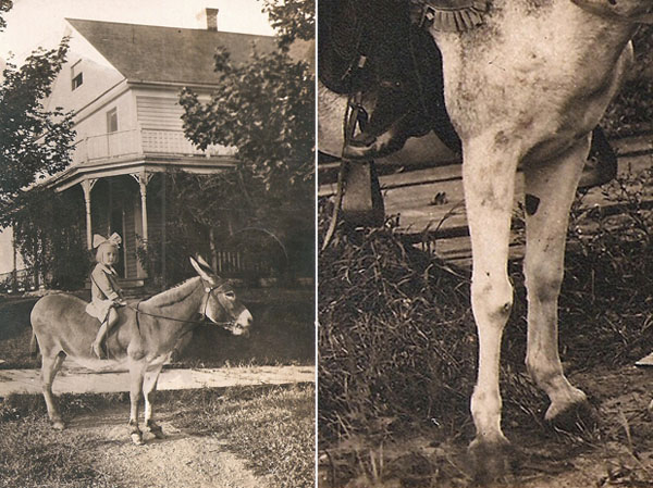 This collection started about 5 years ago when I came across my first photo postcard of a young girl on a donkey taken around 1910. She was clothed in a beautiful dress, a big bow in her hair and shiny black boots that buttoned up the side. I loved the juxtaposition of the girl dressed in her Sunday best on a seemingly stinky old donkey. As I collected more, I started noticing the surroundings: various homes, freshly paved streets, and more specifically- the donkeys themselves. I noticed that most had a circular dark patch on an inner front leg. To this day, I have no idea what those dark patches are about.