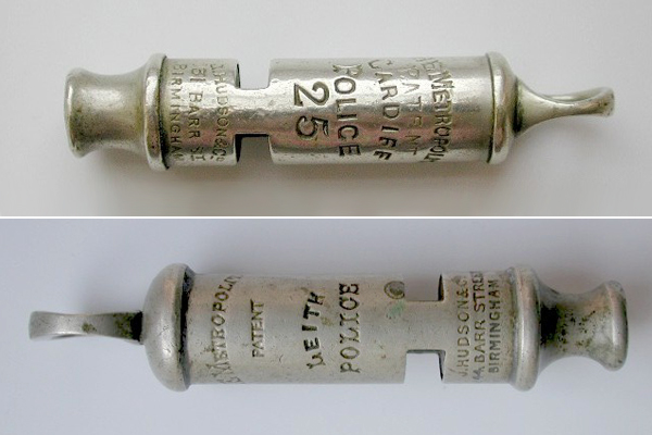 Cardiff and Leith (1908-20) Police Whistles by J.Hudson