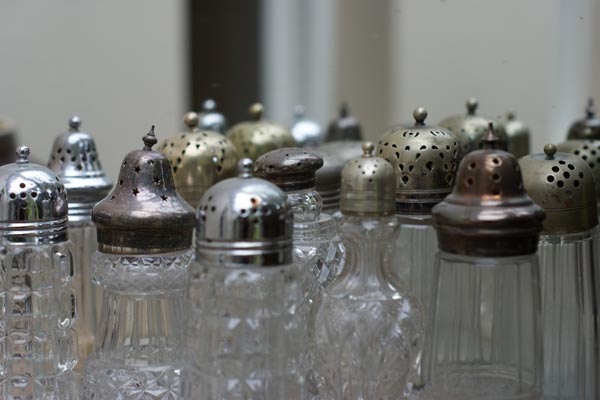 The collection: Antique sugar shakers or muffineers - glass containers with a perforated metal top used to dispense sugar onto food.